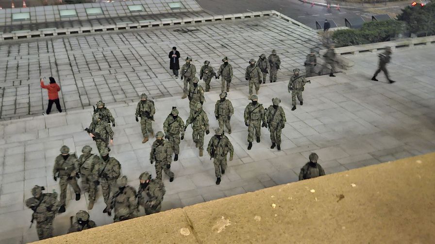 バナー写真:韓国の尹錫悦大統領による非常厳戒令を受け、韓国国会の出入り口に向かう韓国軍武装兵=12月4日、ソウル(共同)