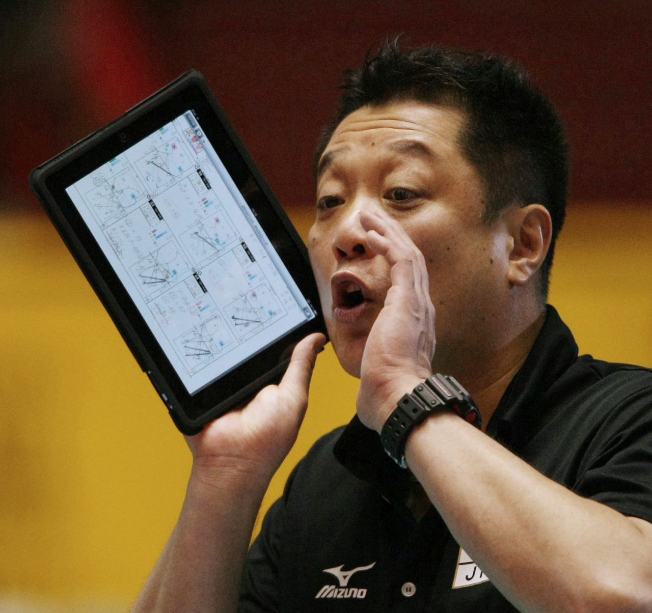 タブレット端末を手に、選手に指示を出すバレーボール女子日本代表の真鍋政義監督(当時)=2010年11月10日、東京・国立代々木競技場(時事)