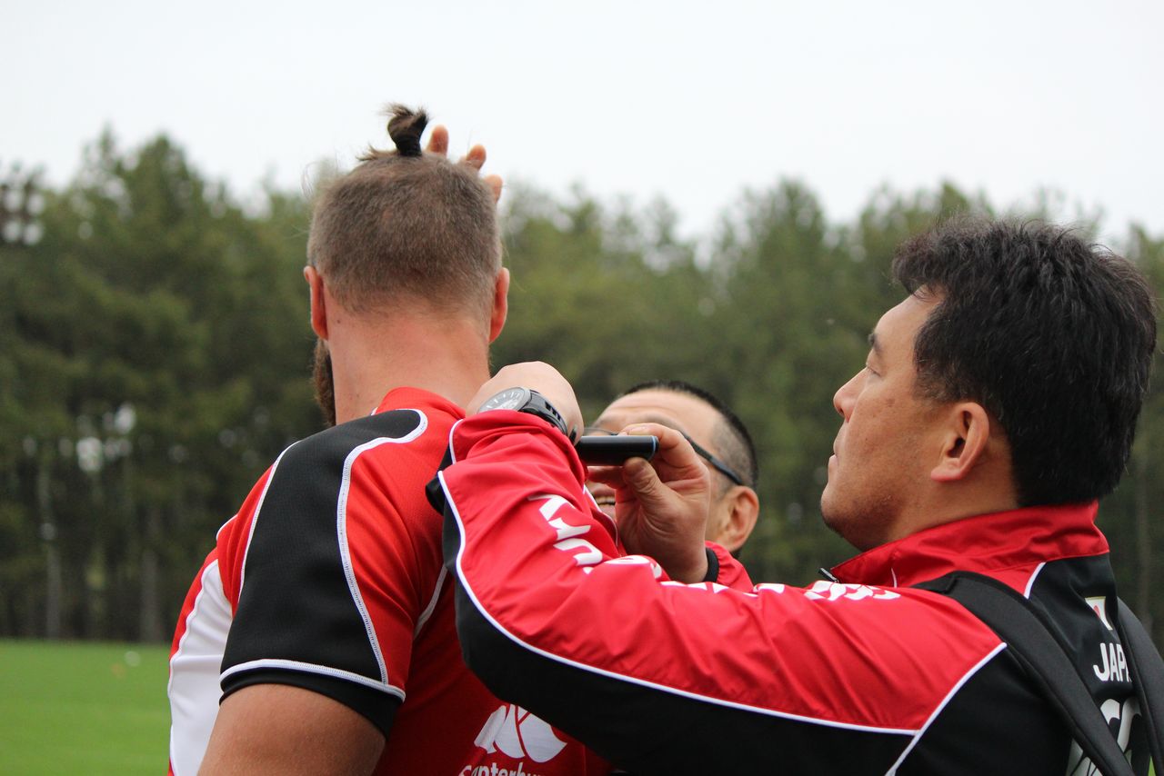 ラグビー日本代表候補の合宿で、選手の背中に全地球測位システム(GPS)を付けるスタッフ=2015年4月7日、宮崎市内(時事)
