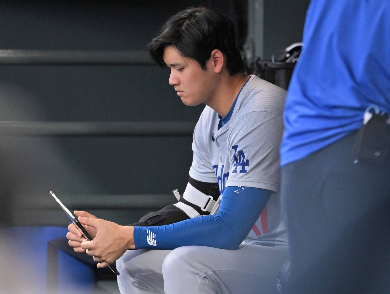 米大リーグのロッキーズ戦のベンチで、タブレット端末を見るドジャースの大谷翔平=2024年6月18日、デンバー(時事)