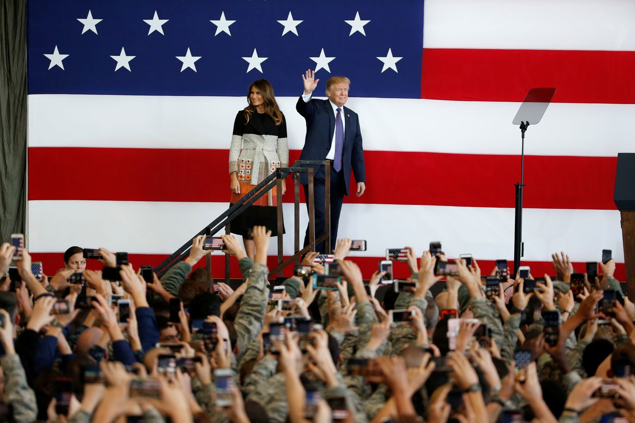 横田基地に到着したトランプ大統領は、集まった1000人以上もの米兵に向かって「われわれは空を、海を、陸を、宇宙を支配している」と演説(ロイター)