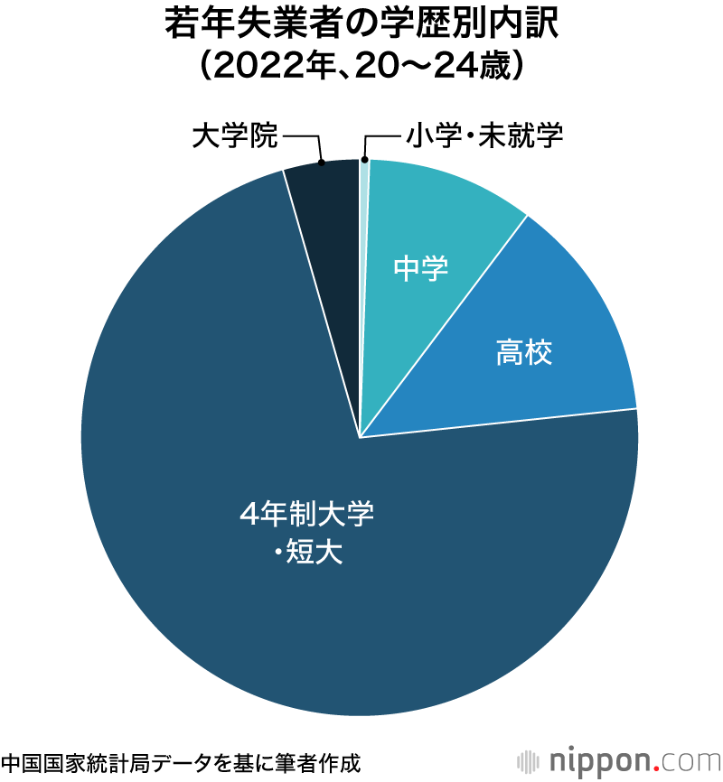 若年失業者の学歴別内訳は、どのようになっているのか。中国の労働統計を使って分析すると、22年の20~24歳の失業者のうち、短大を含む大学卒業者が7割を占めた。また、22年の新卒の労働市場参入者をみると、中卒が192万人、高卒が209万人にとどまるのに対し、大卒は857万人と、中卒・高卒の2倍の規模になっている。