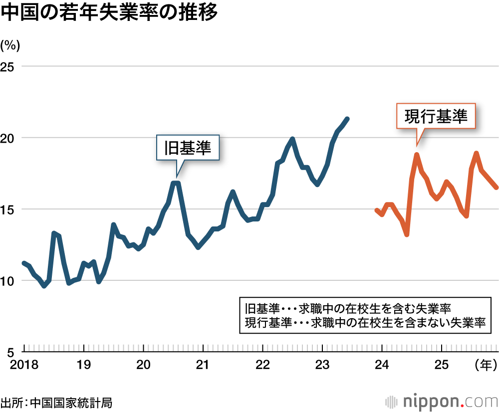 中国国家統計局が発表する若年(16~24歳)失業率は、最新の2025年12月が16.5%。8月に過去最高(24年1月に算出方法改定)の18.9%を記録し、9月以降は徐々に下がっている。しかし、6月に大学の卒業がある中国では7月、8月の失業率は例年高く、その後徐々に卒業生の就職が決まるなどして下がっていく。数字は24年同月を上回り、「高止まりしている」と考えるべきだ。