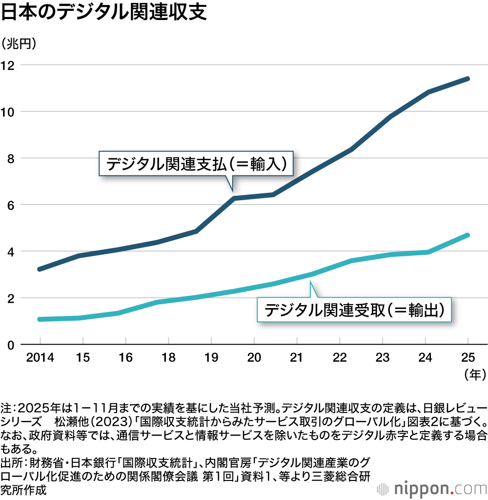 日本の「デジタル赤字」が高水準で推移している。財務省・日本銀行の国際収支統計によれば、日本のデジタル関連のサービス収支は、2025年も6兆円超の赤字の見込みである。25年はアニメ等のコンテンツのライセンス料が含まれる著作権等使用料の受け取りが増え日本からのデジタル関連サービス輸出は4兆円を超えたが、海外への支払いは10兆円を超えている(下図のグラフ)。