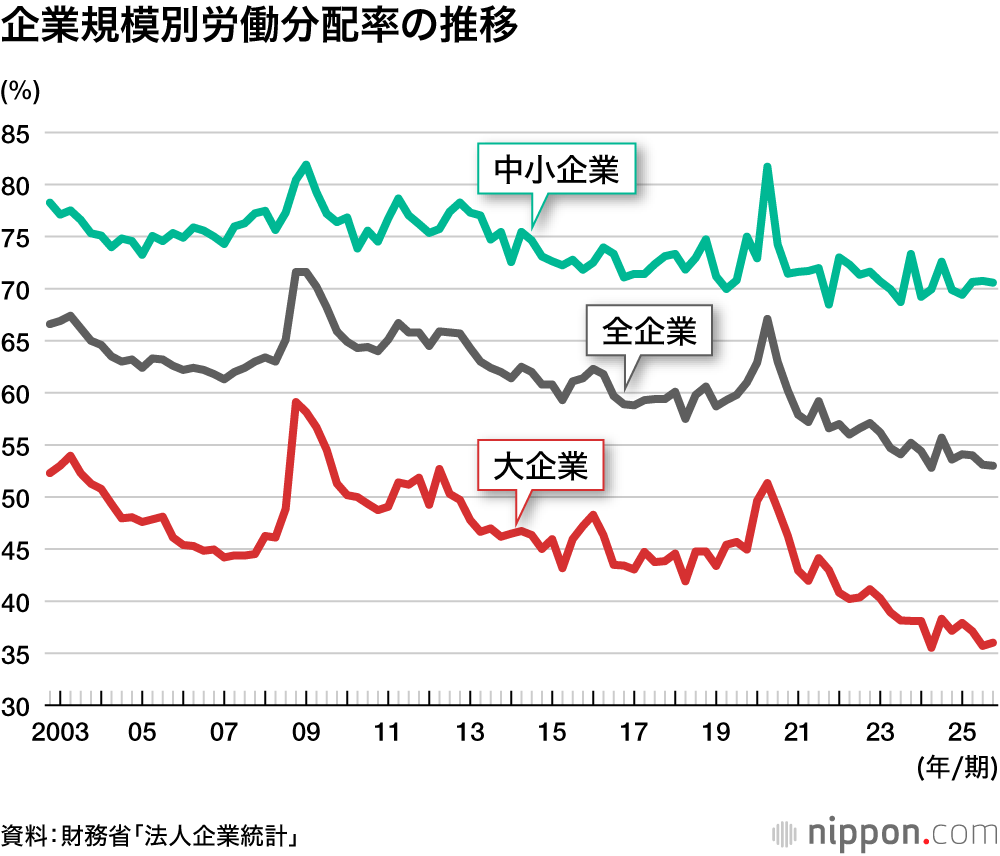 この点ではまず、賃金と生産性との関係に課題が残っている。この関係は労働分配率の動きに示される(※1)(下図)。近年、それは低下傾向をたどっており、依然として生産性上昇に比して賃上げが十分でないことがうかがわれる。ここで注目すべきは、大企業と中小企業で動きが異なることである。低下傾向の主因は大企業であり、中小企業では下げ渋る動きになっている。ただし、それが意味するのは、大企業の賃上げ率が十分でないということではなく、原材料コスト上昇の影響を受けやすい中小企業が、コスト高の価格転嫁を十分できていないことの結果とみるべきである。