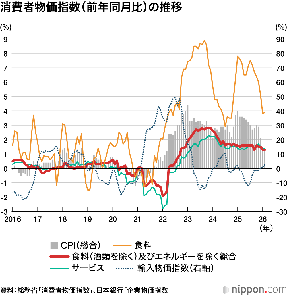 賃金・物価の関係も問題含みである。実質賃金のマイナスが長引いてきたことが問題視されてきたが、昨年については賃上げ率もかなり上昇してきており、むしろ問題は高過ぎるインフレ率にあった。だが通常のインフレではなく、「跛行(はこう)型インフレ」ともいうべき状況にあることが対処を難しくしている。つまり、ここ数年インフレ率が2%を相当程度上回ったのは、エネルギーあるいは食料品の高騰が主因であり、食品・エネルギーを除くベースでは2024年後半以降は2%を割る状況にある(下図)。