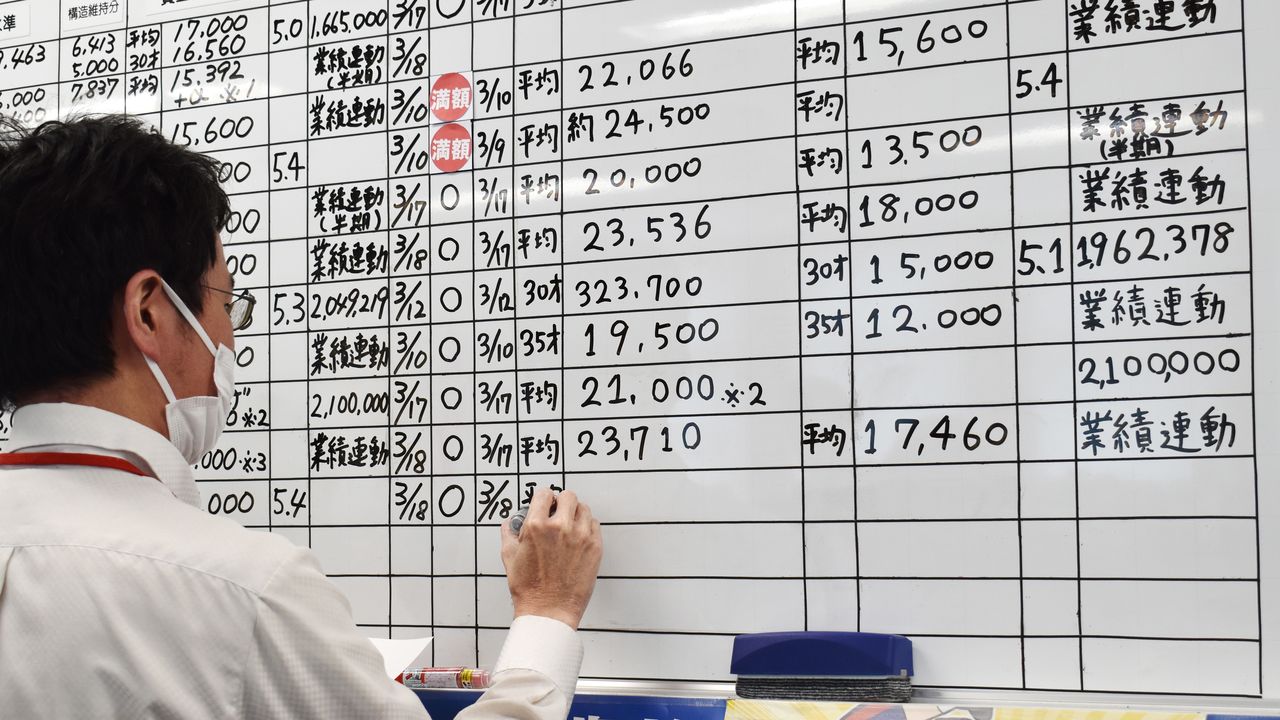 バナー写真:2026年春闘の回答で埋まる「ものづくり産業労働組合(JAM)」本部のホワイトボード=2026年3月18日、東京都港区(時事)