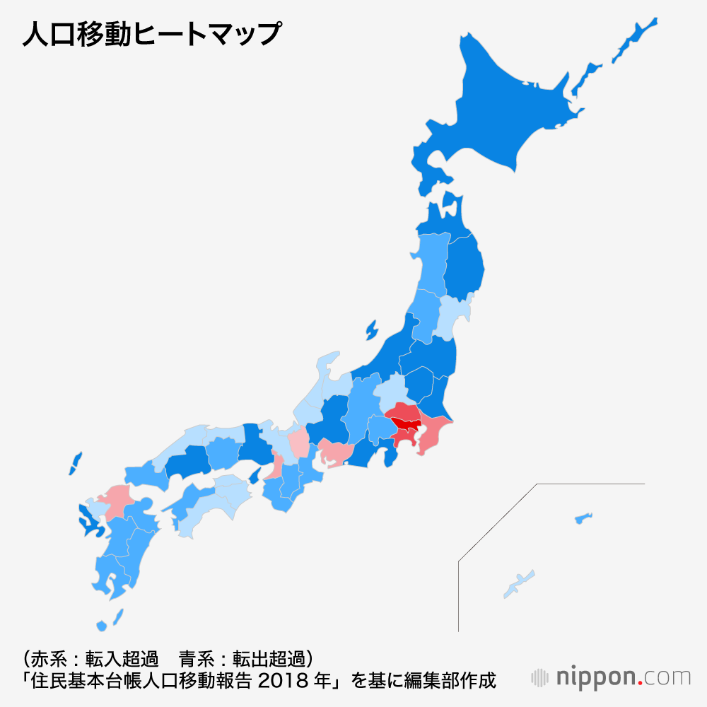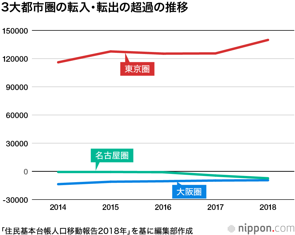 総務省が住民基本台帳に基づいてまとめた2018年の人口移動報告によると、東京都内への転入超過数は前年比9.2%増の7万9844人だった。都道府県別で転入超過となったのは、東京都、埼玉県、神奈川県、千葉県、愛知県、福岡県、大阪府、滋賀県の8都府県のみ。中でも、東京圏への流入超過が際立っており、一極集中に歯止めが掛かっていない。