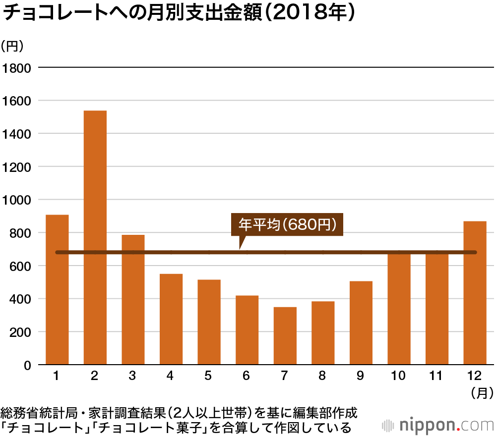 2018年の1世帯あたりのチョコレートへの月別支出金額を見ると、2月は1537円と突出して高く、年平均680円の倍以上に相当する。