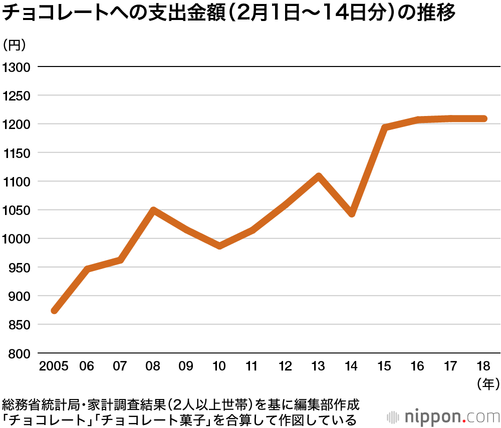 バレンタインデーまで(2月1日~14日)のチョコレートへの支出金額の年ごとの推移を見ると、リーマン・ショック後の2009年、10年はマイナスとなったものの、その後は再び盛り返している。直近の4年間は1200円前後で推移している。