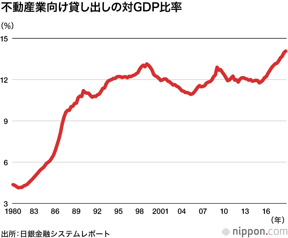 日銀の金融システムリポートは、2018年末の不動産業向け貸し出しの対国内総生産(GDP)比率の高さが90年末以来の「過熱」状態にあると分析。新規の融資額はここ1、2年は減少しているものの、残高は増え続け対GDP比率が14.1%と過去最大になった。