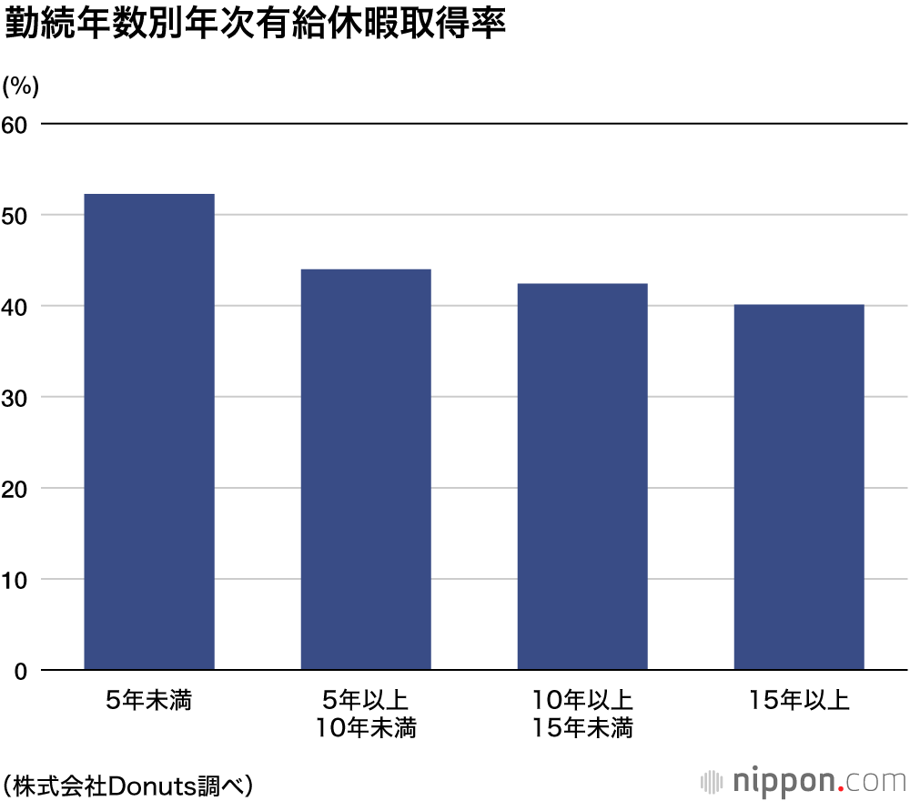 一方、年次有給休暇取得率では、性別での大きな差がなく、平均約50.2%の取得。世代別では、30代が51.96%と最も高く、最も低いのは50代の46.09%だった。一方、勤続年数別でみると取得率にかなりの差があり、5年未満の従業員が52.25%であるのに対し、15年以上の従業員は40.11%にとどまった。