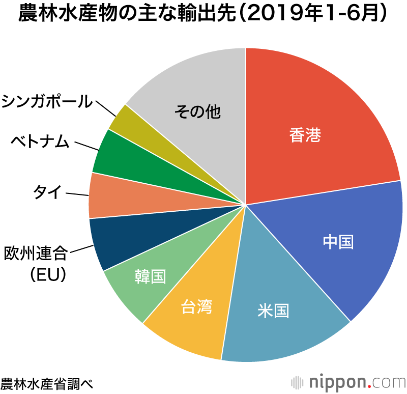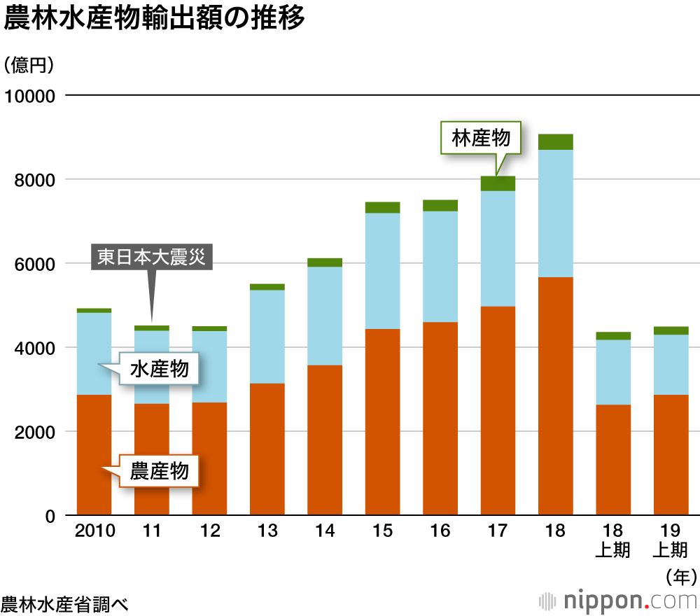 近年順調に伸びていた日本の農林水産物・食品の輸出だが、2019年上半期(1-6月)は微増にとどまる結果に。政府目標である1兆円の達成に”黄信号”が灯っている。