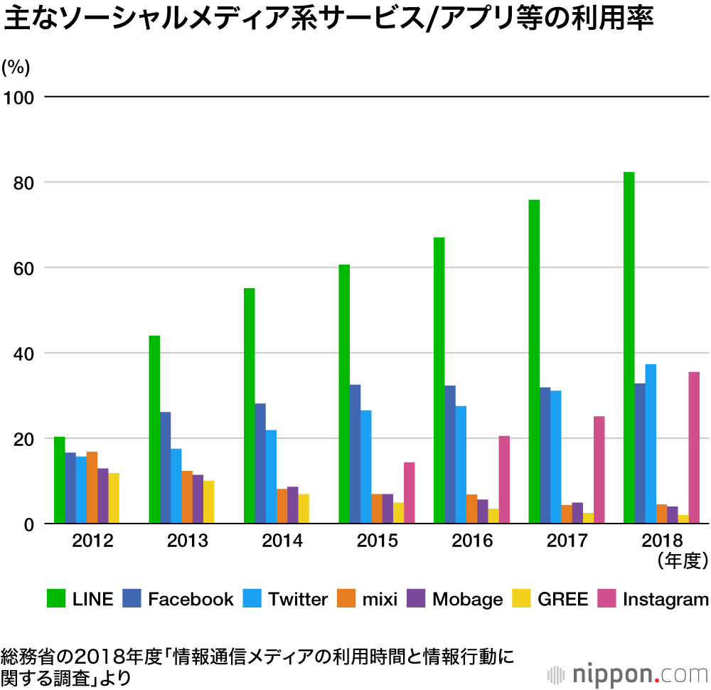 ユーザー同士の交流を主な目的とするソーシャルメディア系サービス/アプリは、利用率が高い順に、LINE(82.3%)、Twitter(37.3%)、Instagram(35.5%)、Facebook(32.8%)だった。中でもInstagramの利用率は、前回調査の25.1%から今回35.5%と、10ポイント以上上昇した。
