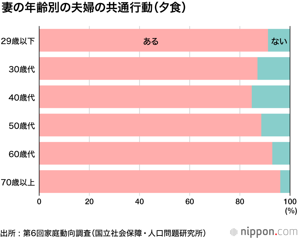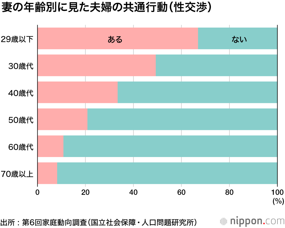 妻の年齢別に見た、夫婦の共通行動については、「夕食」は全ての年代で8~9割台の人が「一緒にする」と答えている。一方、「性交渉」で、「ある」が過半数を上回ったのは、29歳以下だけだった。