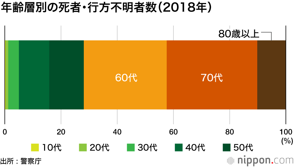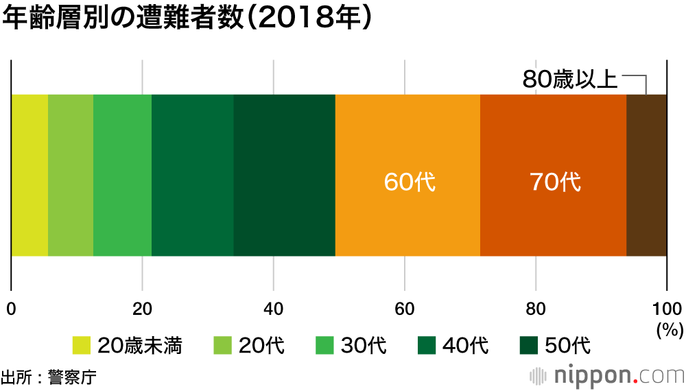 ただ、遭難者の年齢層別の内訳を見ると、70歳代(22.3%)が最も多く、60歳代(22.1%)、50歳代(15.5%)と続く。死者・行方不明者では60代以上が7割強を占めるなどシニアの事故が目立つ。警察庁では、「万全な装備をした上で、気象条件や体力に見合った登山計画を立てることが重要」と呼び掛けている。