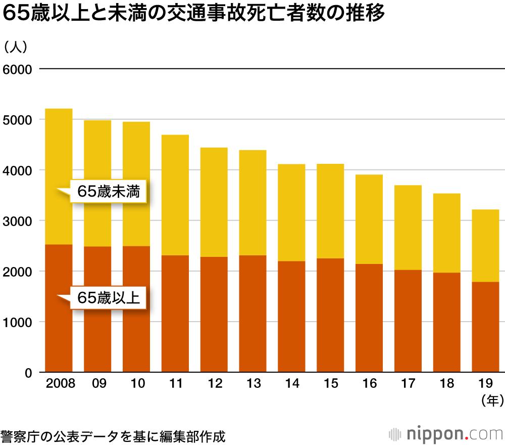 65歳以上の高齢者の死者数は前年より184人減の1782人となったが、死者全体に占める割合は55.4%に高止まりしている。政府が目標とする20年交通事故死者数2500人以下を達成するには、さらなる、高齢者事故対策が欠かせない。