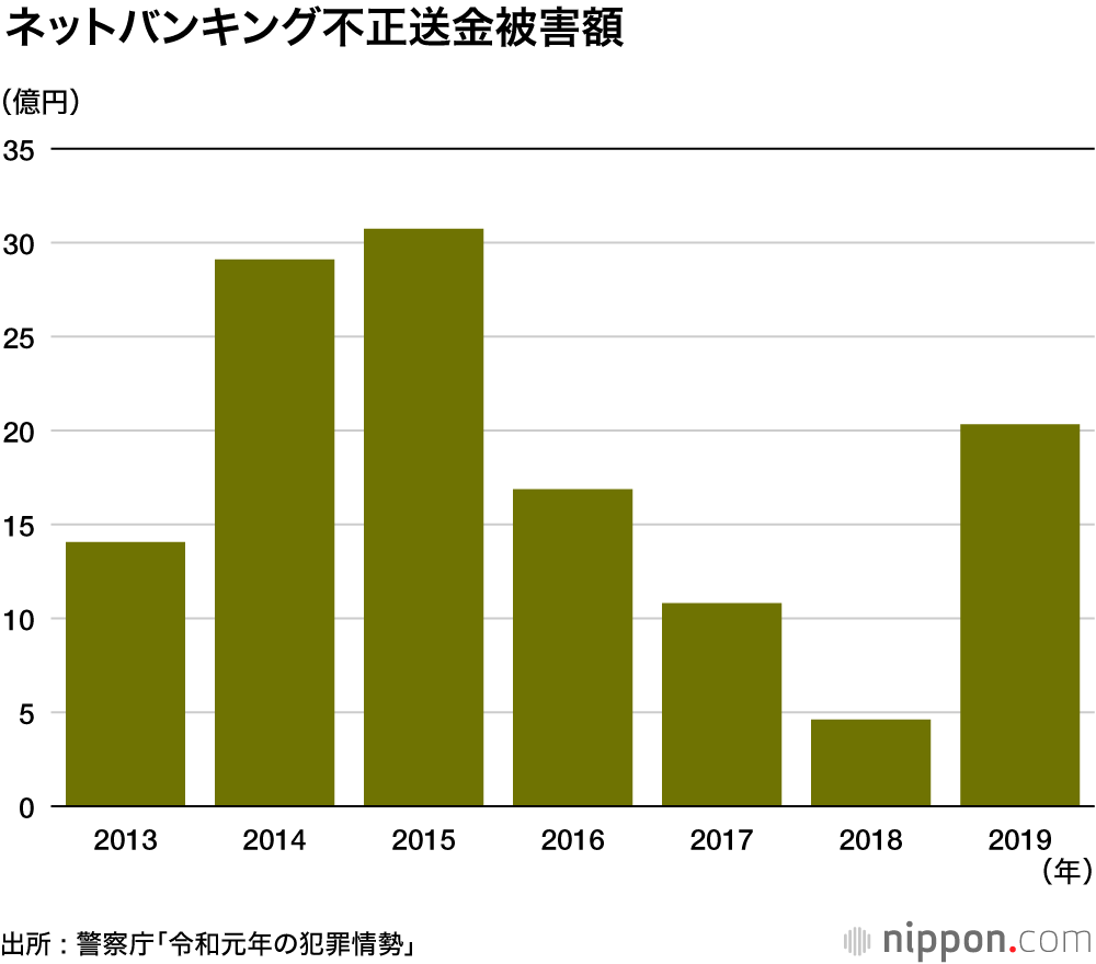 インターネットバンキングの不正送金被害額は前年比4.4倍の20億3200万円に急増した。2016年以降、金融機関がセキュリティ対策を強化したことで、発生件数・被害額ともに減少傾向が続いていたが、2019年9月から急増に転じたという。