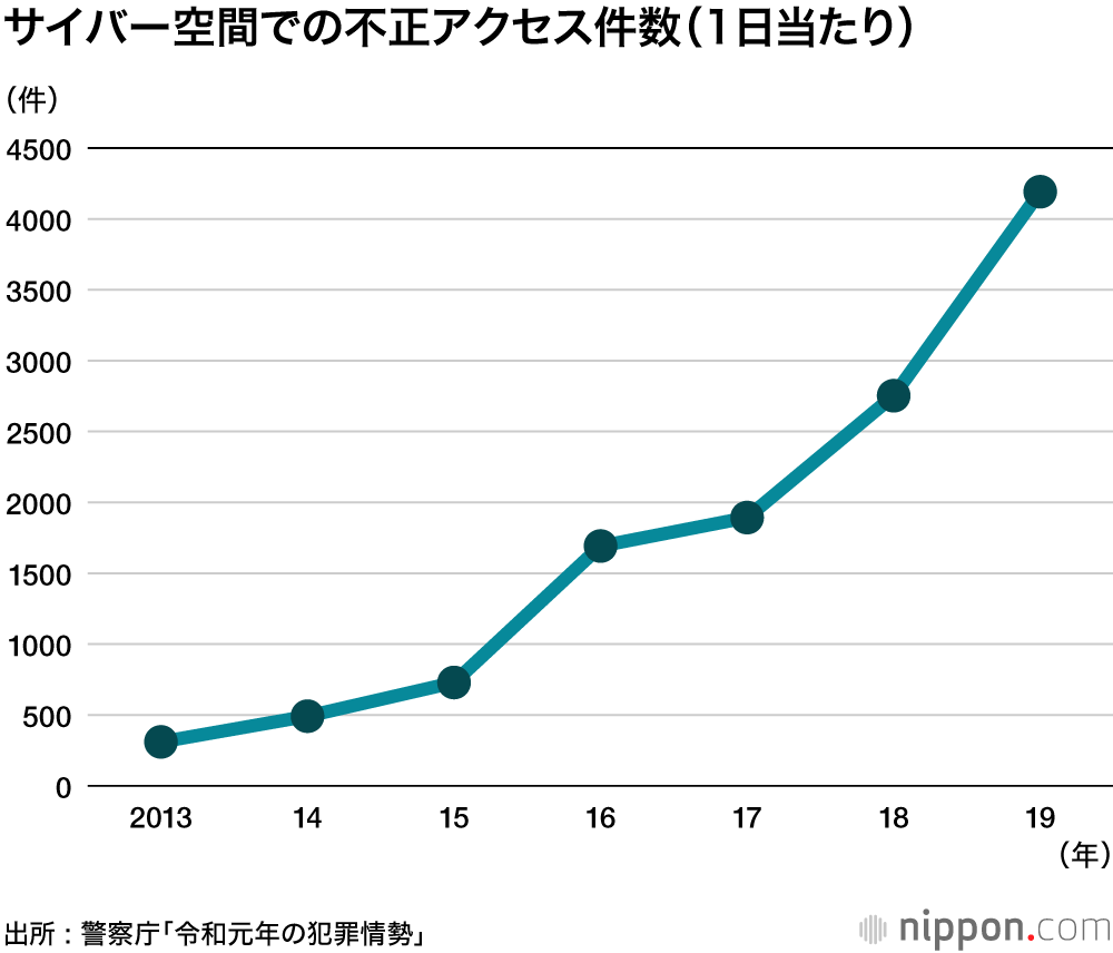 サイバー空間における不審なアクセスは、警察庁がサイバー空間上に設置した1センサー当たり1日平均4192.0件で、前年の2752.8件から急増した。