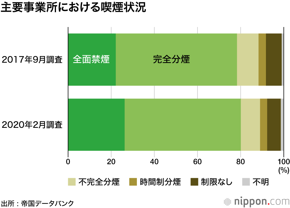 帝国データバンクが全国2万3668社を対象に喫煙について調査したところ、本社や主要事業所に「適切な換気がされている喫煙場所がある」「屋外に喫煙場所を設けている」完全分煙を実施しいる企業は 53.9%で過半数だった。「社内において喫煙は不可」とする全面禁煙は 26.2%で 4 社に1社が導入しており、前回調査(2017年9月実施)から 4.1 ポイント増加した。「屋内に適切な換気がされていない喫煙場所がある」不完全分煙が 8.9%、「決められた時間に指定場所での喫煙が可能となる」時間制分煙が 3.3%で続いた。