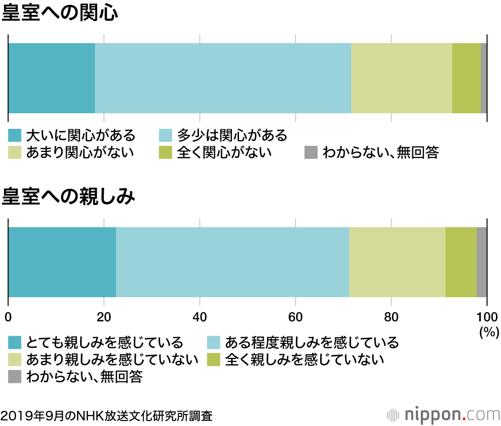 皇室への関心について、「大いに関心がある」と「多少は関心がある」は合わせて72%、「関心がない」「まったく関心がない」は合わせて27%だった。「(大いに、もしくは多少は)関心がある」と答えた人のうち、男性は67%、女性は76%で、女性の方がより高い関心を持っていた。年齢別では、おおむね高い年層ほど関心が高かった。