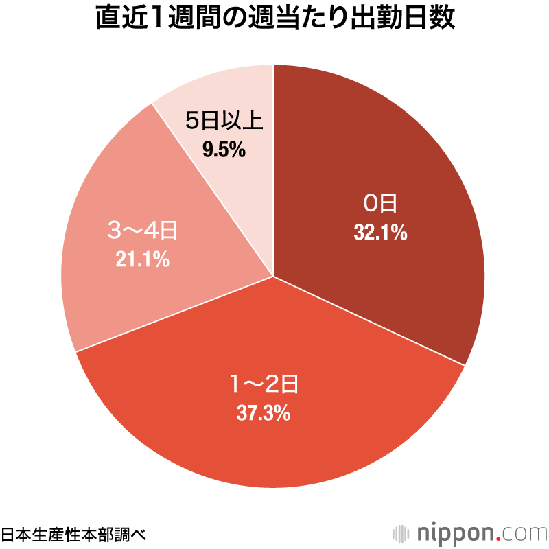 感染拡大を受けて各企業がテレワーク導入を進める中、直近の1週間で週何日出勤したかを営業日ベースで尋ねたところ、「1~2日」が37.3%で最も多く、以下「0日」(32.1%)、「3~4日」(21.1%)、「5日以上」(9.5%)の順となった。0日から2日までの回答を合わせると約7割に達した。これは専門的・技術的な仕事、事務的な仕事といったホワイトカラー職種についている回答者の割合が高く、その分野で在宅勤務の実施率が高かったことが背景にあるとみられる。