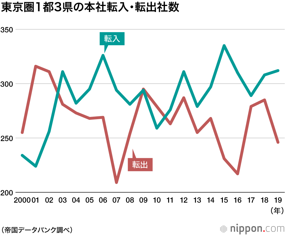 帝国データバンクの2019年の企業の本社移転に関する調査によると、東京都に周辺の3県(神奈川県、埼玉県、千葉県)を加えた東京圏に転入した企業は312社、逆に東京圏から転出した企業は246社にとどまり、66社の「転入超過」となった。転入超過は2011年から9年連続。