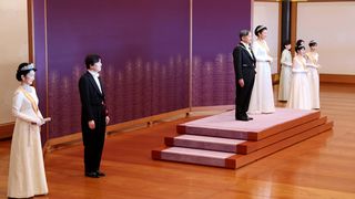 バナー写真 : 天皇陛下が即位された2019年5月1日の「即位後朝見の儀」の様子。最前列に並ぶ成年皇族はほとんどが白いドレス姿の女性皇族(時事)