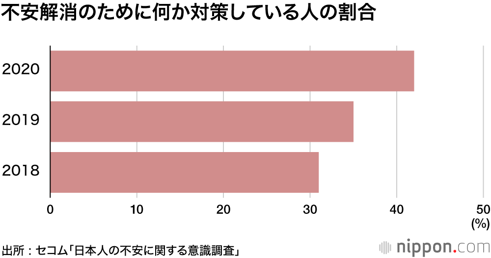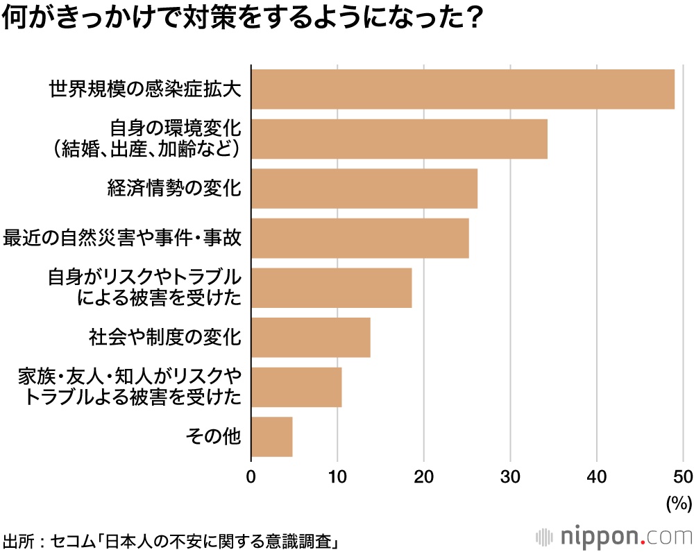 「不安解消のために何か対策をしている人」の割合は、例年よりも多い42%だったが、そのきっかけとなったのも、「世界規模の感染症の拡大」だった。