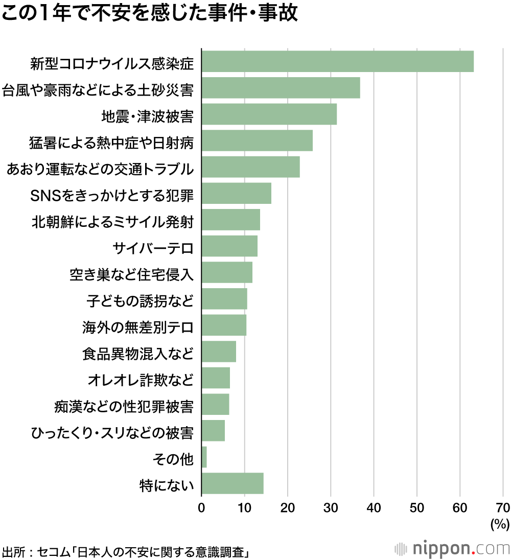 「この1年で不安を感じた事件・事故」も、新型コロナウイルス感染症が63.2%で圧倒的なトップ。中国・武漢での肺炎がニュースで取り上げられるようになったのは2020年1月、日本で本格的に感染者が増え始めたのは3月半ば以降。わずか数カ月で人々の心をここまで支配してしまったという点でも、コロナはとてつもない影響力を持っている。