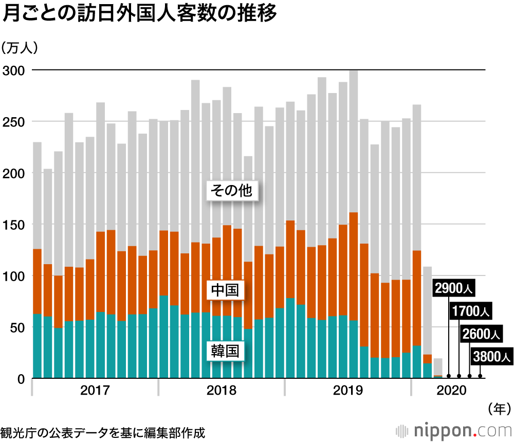 もしも世界がコロナ禍に見舞われることなく、もしも予定通り東京五輪が開催されていたならば、恐らく、2020年7月の訪日外国人客数は19年実績を上回っていただろう。現実は99.9%減の壊滅状態。「3800人」の集客を分かりやすく説明するならば、NHKホール(補助席込み3601席)は満席にできるけれど、ドームツアー開催にはほど遠いレベル。