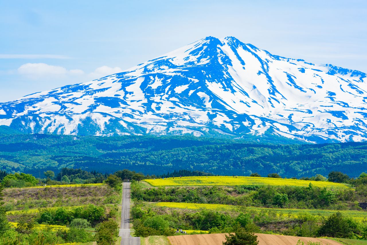 山形県と秋田県の県境にある独立峰。裾野は浜辺まで伸び広がり、山頂は海岸線から16キロメートルの至近距離にある。