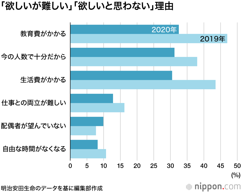 「さらに欲しいが難しい」「欲しいと思わない」と答えた人でも、「教育費がかかる」「生活費がかかる」といった経済的理由を挙げる人は前年と比べて大幅に減少した。