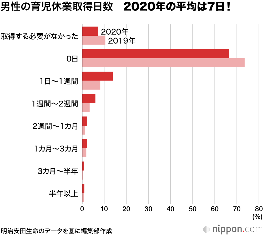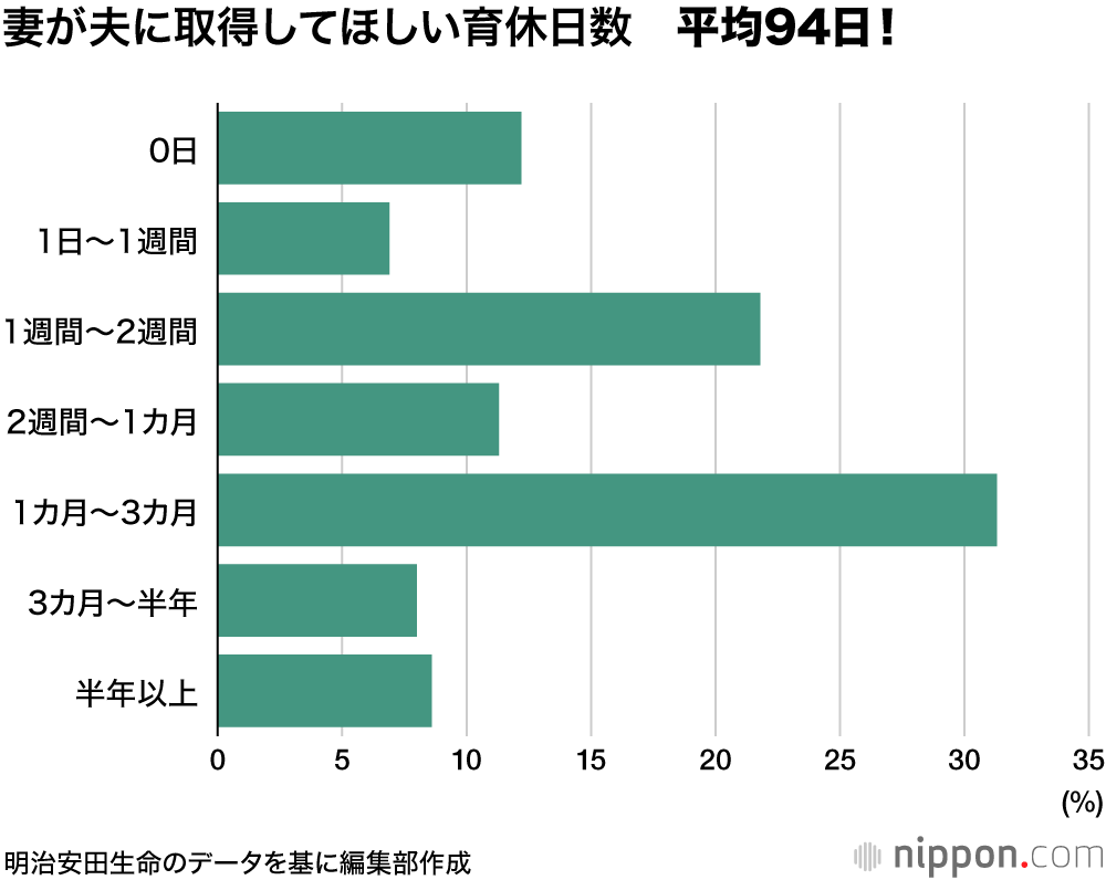 男性の育児休暇取得日数は「0日」の割合が前年より7ポイント減少して66.5%となるなど取得率が向上。平均取得日数は7日となった。一方、女性に聞いた「夫に取ってもらいたい育休期間」の平均は94日で、まだまだ理想と現実に大きな隔たりがある。明治安田生命では「男性は形式的な“とるだけ育休”ではなく、女性の理想とする日数を取得し、より育児に携わる必要がある」と指摘している。