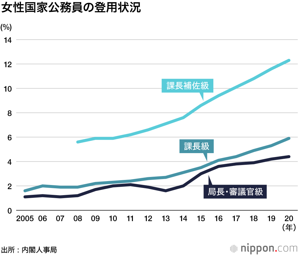内閣人事局のまとめによると、2020年7月時点で中央官庁の局長や審議官などの「指定職」相当のポストに就いている国家公務員1053人のうち女性は46人だった。女性割合は前年比0.2ポイント増の4.4%で、05年の調査開始以降の最高値となったが、政府が20年度末の目標値として掲げている5%の達成は困難だ。
