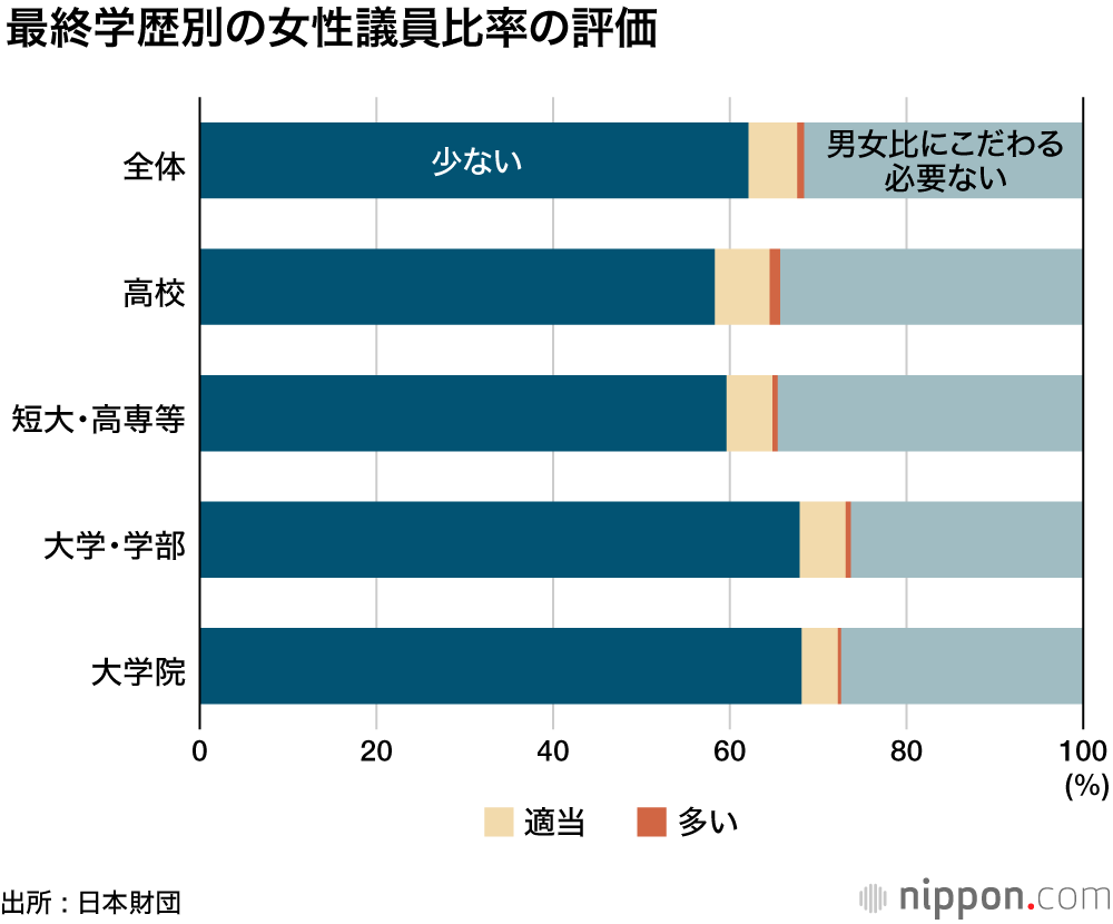この現状を当の女性たちはどう見ているのか。日本財団が18~69歳の女性1万人を対象に実施したアンケート調査で、女性議員比率が「少ない」と答えたのは全体で62.2%だったが、「男女比にこだわる必要はない」と答えた人も31.6%に上った。最終学歴別でみると、大学、大学院卒は7割近くが「少ない」と回答し、高校や短大・高専等と比べて高いのが目立った。