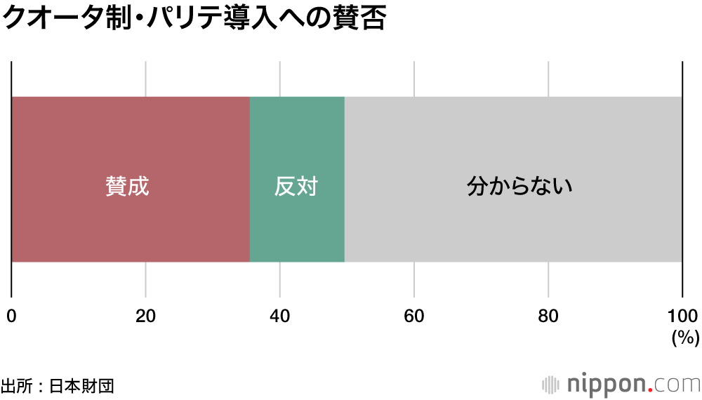 海外では、政治の世界での男女格差解消のため、女性候補者に一定の数や比率を割り当てる「クオータ制」や、比例代表の候補者名簿を男女交互にする「パリテ」などを導入する事例がある。これらの制度を日本にも導入する是非について聞いたところ、「賛成」35.5%で、「反対」14.1%を大幅に上回ったものの、「分からない」が過半数だった。