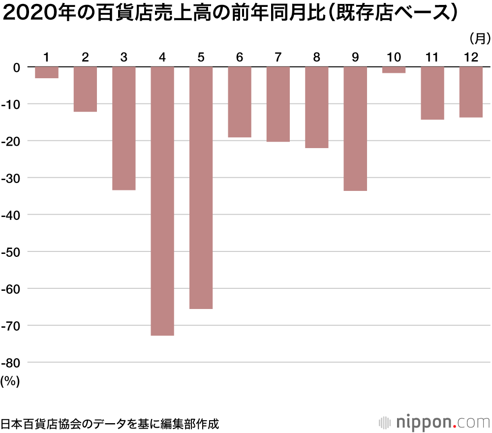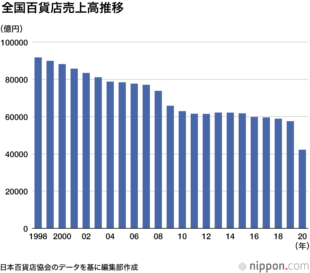 日本百貨店協会のまとめで、2020年の全国百貨店の売上高は前年比25.7%減の4兆2204億円まで落ち込んだ。1975年(4兆651億円)以来45年ぶりの低水準となった。新型コロナウイルスの感染拡大を受け、各社とも春先に多くの店舗で時短営業や臨時休業を余儀なくされたことや、入国規制によるインバウンド需要の消失などが響いた。