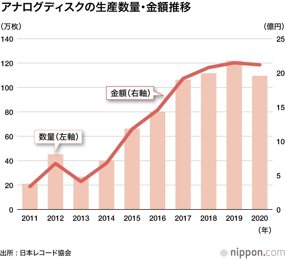 日本レコード協会によると、アナログディスク生産数量は2009年の10万2000枚を底にほぼ一貫して増加。19年には121万9000枚にまで回復した。20年は新型コロナウイルスの逆風が吹き、前年比10%減の109万5000枚と落ち込んだものの、21%減のCDと比べ健闘したといえる。