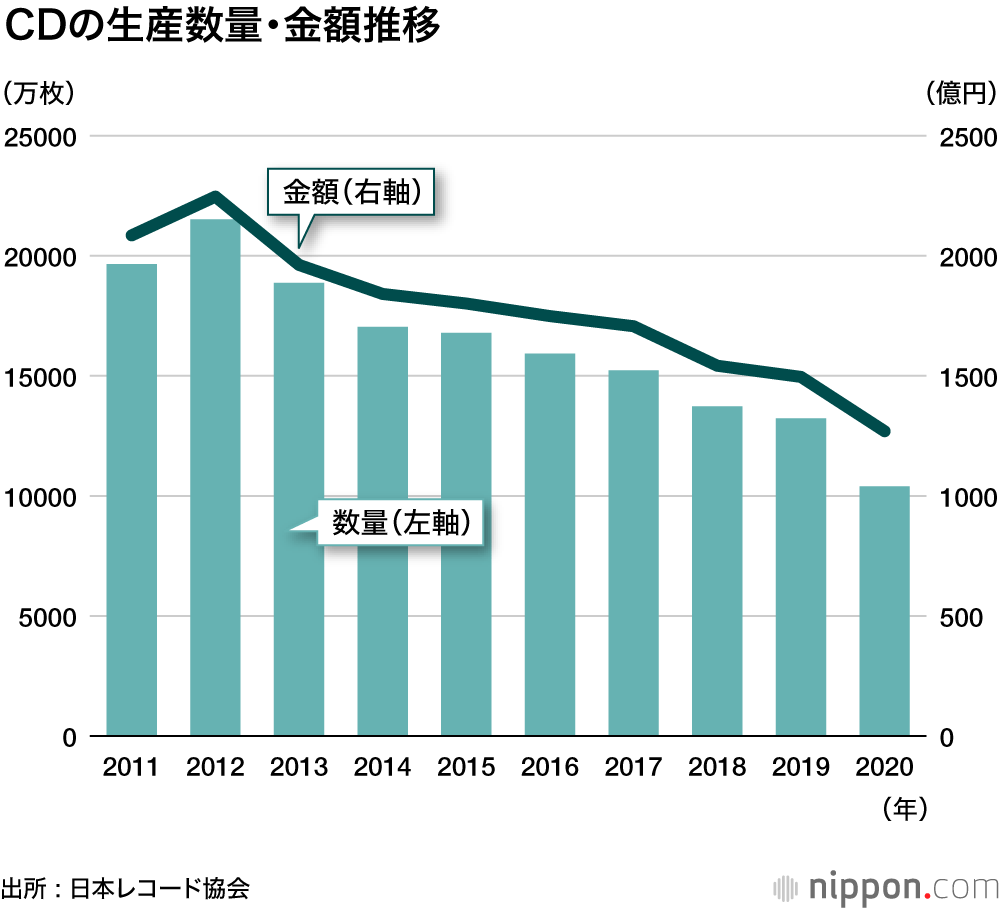 金額ベースでは1%減にとどまり、CDの15%減に比べ底固さを示した。11~20年の10年間を見ると、CDの右肩下がりとは対照的に、レコード生産は順調に伸びている。ディスクの材質にこだわった高音質盤を投入するなどで、金額の伸びは数量を上回って推移する。(以下の2枚のグラフは縦軸の数字が異なる)