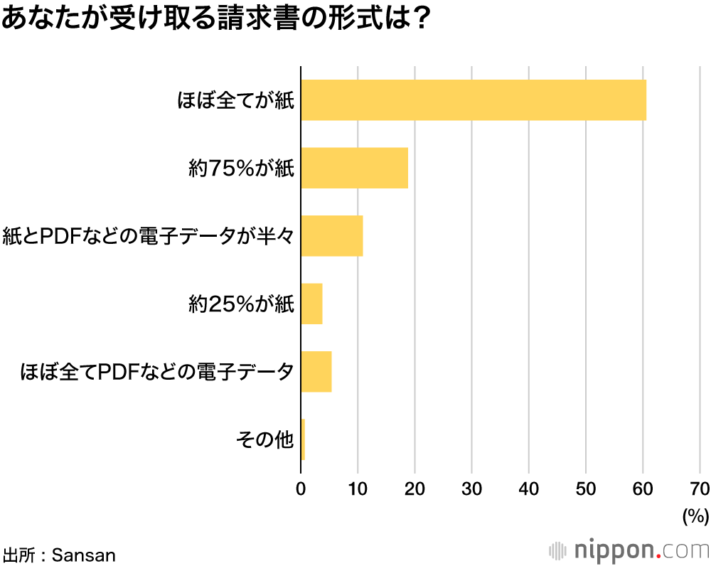 テレワークが推奨される以前から、業務のペーパーレス化も企業経営の課題の一つとなっていたはずだが、受け取る請求書について「ほぼ全てが紙」と答えた人が60.6%、「75%が紙」「紙とPDFなどの電子形式が半々」を合わせると、「受け取る請求書の半数以上が紙」の人が9割を超えた。