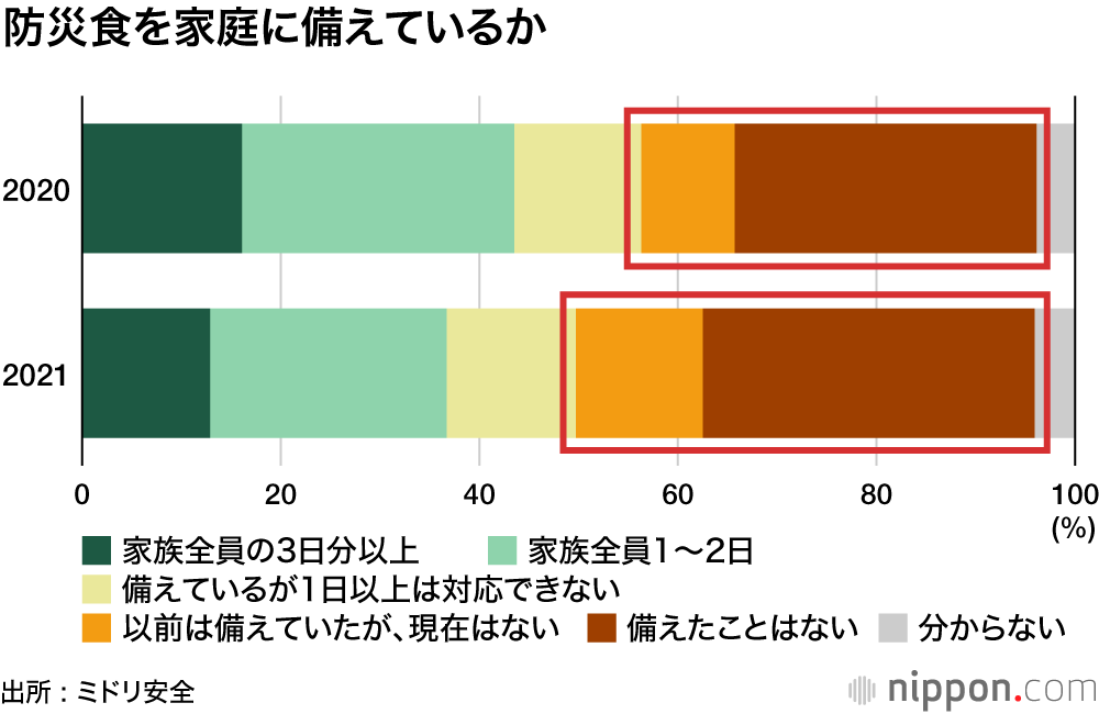防災食(非常食)を自宅に備えているかを聞いたところ、「家族全員が3日以上対応できる量を備えている」と回答した人は、わずか12.9%。一方、防災食の備えはゼロ(「以前は備えていたが、現在はない」「備えたことはない」の合計)の人は46.3%に上った。全く備えていない人の割合は前年の調査より6.4ポイント増加した。