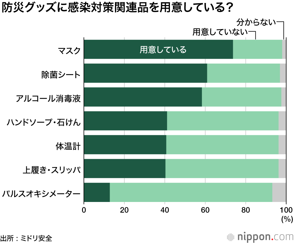 避難用の防災グッズを何かしら用意していると回答した494人に、「防災グッズの中に新型コロナウイルスなどの感染症対策の準備はあるか」を聞いたところ、「マスク」を用意している人が73.7%と最も多く、「除菌シート」60.9%、「アルコール消毒液」58.3%が続いた。
