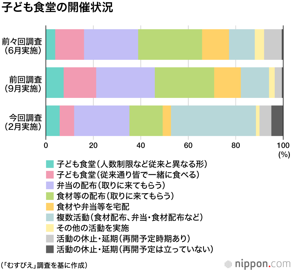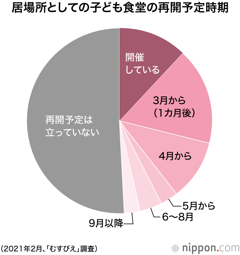 「むすびえ」本部は、「密になる状態を避けるため、どうしても集う場を作りにくくなっている。感染リスクが高いとされるボランティアの高齢者らと子どもとの直接の交流も、今は難しい。厳しい状況は続くが、子どもの居場所は絶対に必要だ」と指摘。今後は自治体や自治会と協力して、公民館などの場所を確保する努力を継続するとともに、運営団体支援の一環として感染防止対策について説明する動画の制作を計画しているという。