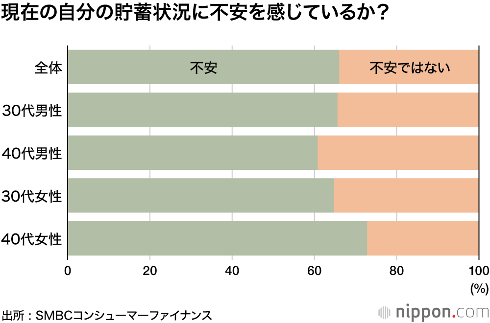 とはいえ、現在の貯蓄額で満足しているわけではない。貯蓄状況に不安を感じている人は全体の66%。40代女性は72.8%と不安に感じている人の割合が最も高くなった。