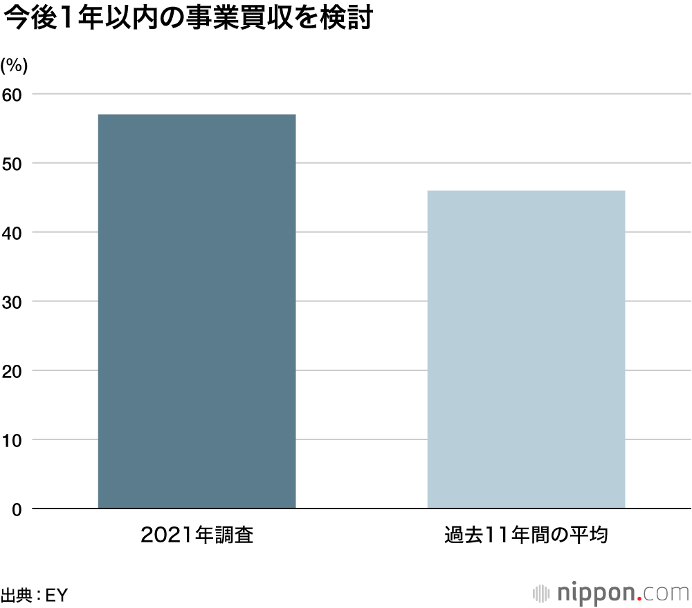 調査では、日本の経営層の「今後1年間に事業を買収する計画がある」との回答は57%に達し、過去11年(2010年~20年)の調査結果の平均値(46%)を上回った。多くの企業がコロナ危機後の需要の拡大などを見込み、M&Aを検討していることがうかがえる。M&Aを検討していることがうかがえる。