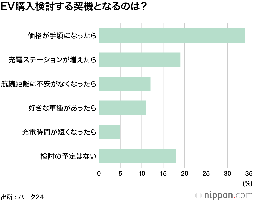 EV検討の条件を聞いたところ、「価格が手頃になったら」が34%で最も多く、「充電ステーションが増えたら」19%、「航続距離に不安がなくなったら」12%と続いた。「検討する予定がない」も18%だった。