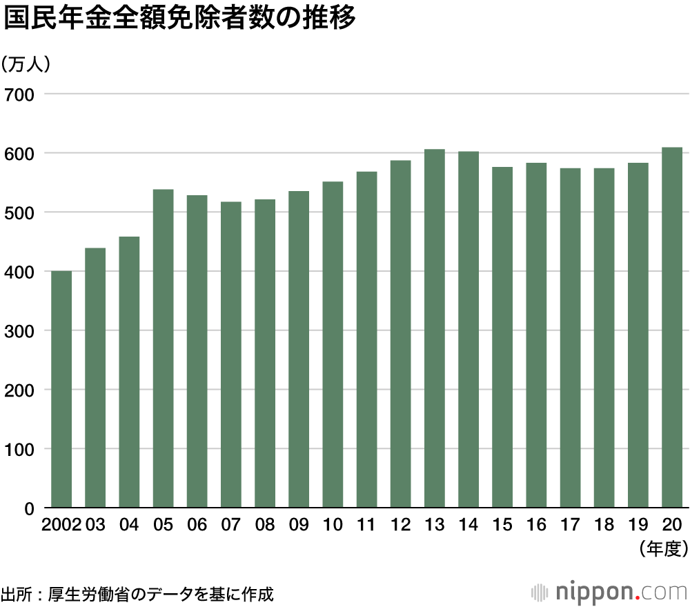 国民年金保険料の納付を全額免除や猶予された人が、2020年度は前年度より26万人増えて609万人となった。基礎年金制度が導入された1986年度以降、最多となった。