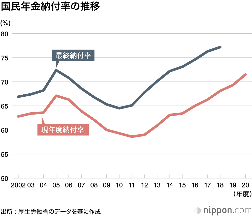 国民年金の加入者は20年度末で1449万人。保険料の納付率は前年度より2.2ポイント上昇して71.5%となった。9年連続の改善。保険料は過去2年さかのぼって納付できる仕組みで、18年度の最終納付率も8年連続で上昇し77.2%となった。