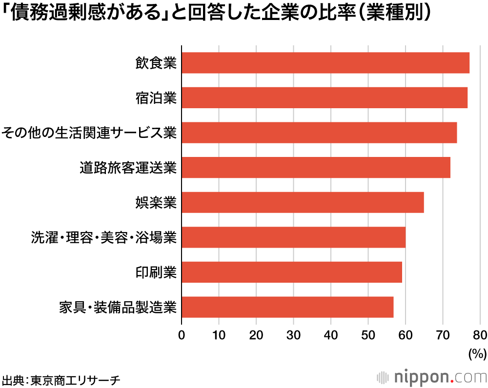 業種別で過剰債務の比率が最も高かったのは飲食業。次いで宿泊業、その他生活関連サービス業、道路旅客運送業などとなっており、新型コロナの感染拡大で人流停滞の影響を直接受けた業界が上位を占めた。